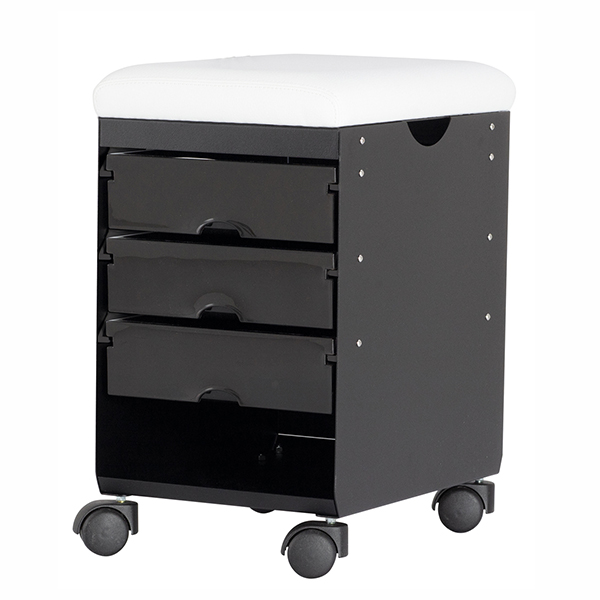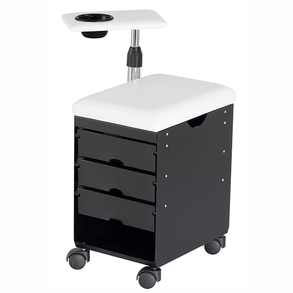 Cube manicure is a metal beauty trolley with three sliding and extractable drawers. Complete with padded seat with skai covering of your choice and height-adjustable hand rest support.