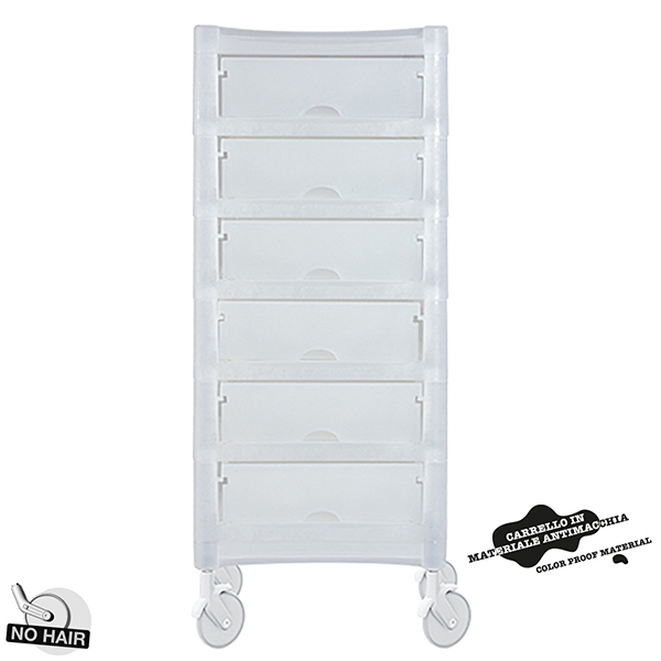 Column beauty trolley, with the possibility of six drawers, all sliding, interchangeable and equipped with internal dividers. It is equipped with lateral supports for hairdryers and plates and slots for bottles and vials.